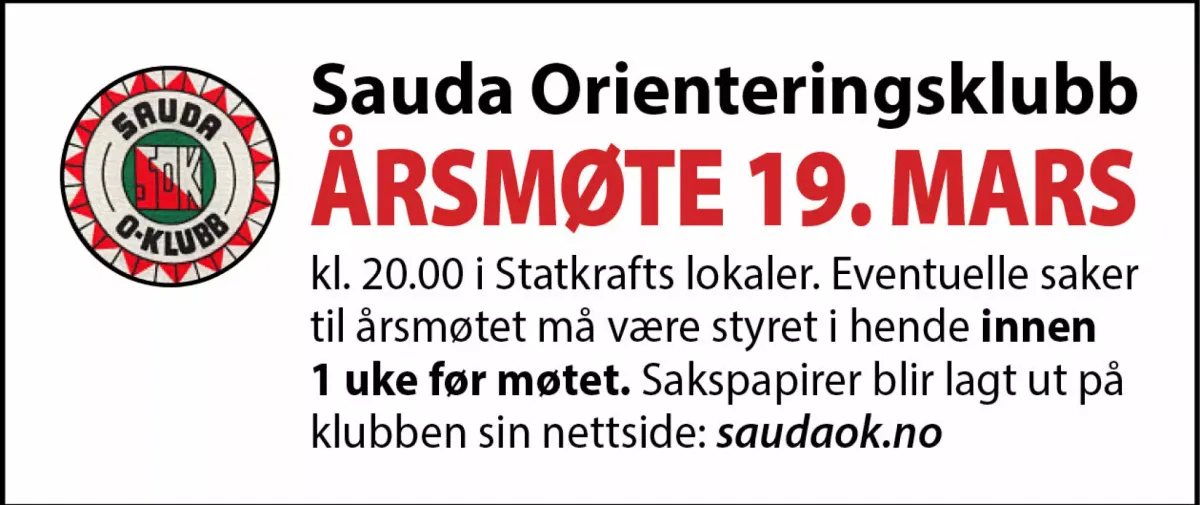 kl. 20.00 i Statkrafts lokaler. Eventuelle saker til årsmøtet må være styret i hende innen 1 uke før møtet. Sakspapirer blir lagt ut på klubben sin nettside: saudaok.no