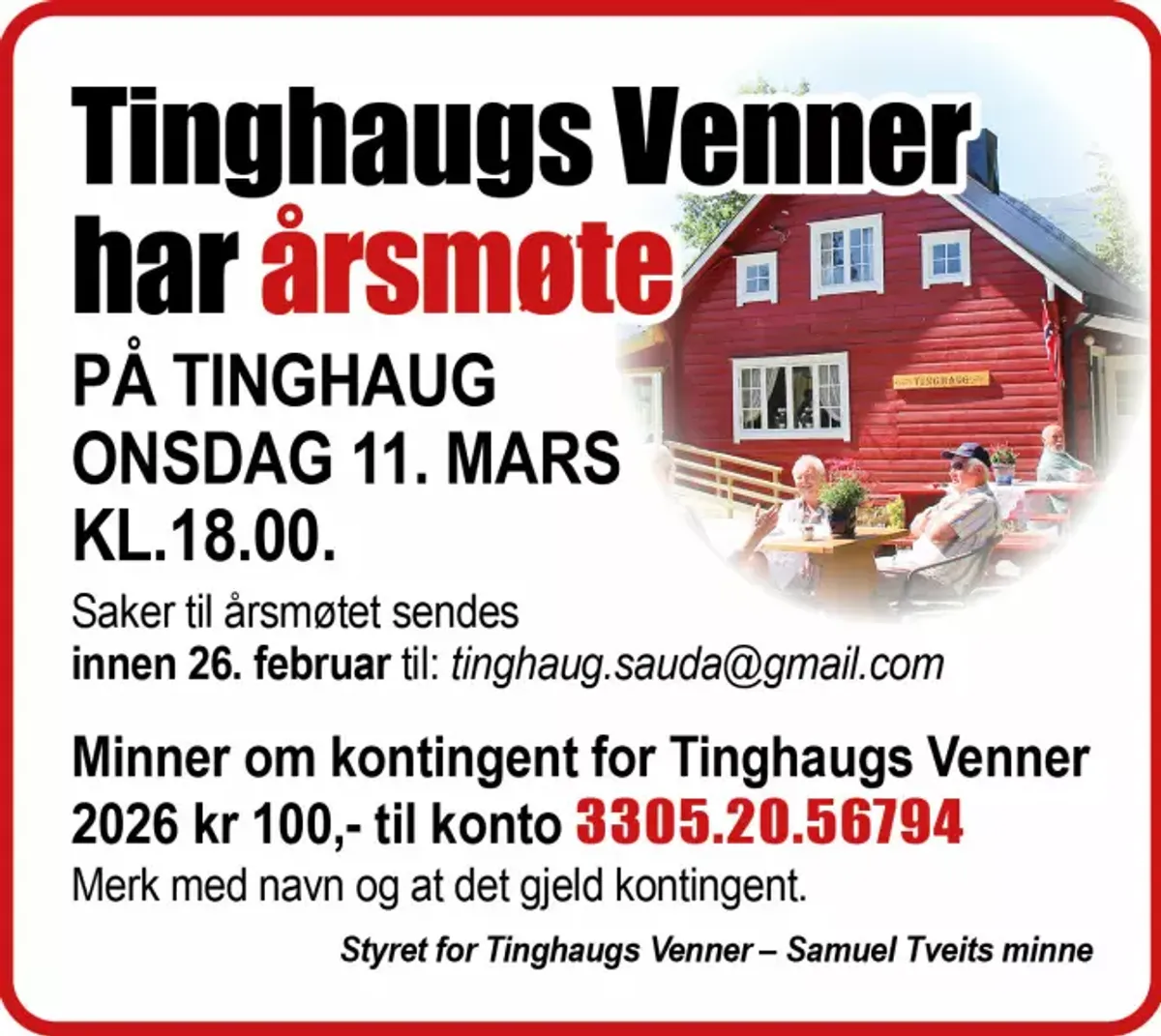 Saker til årsmøtet sendes innen 26. februar til: tinghaug.sauda@gmail.com Minner om kontingent for Tinghaugs Venner 2026 kr 100,- til konto 3305.20.56794 Merk med navn og at det gjelder kontingent.